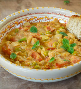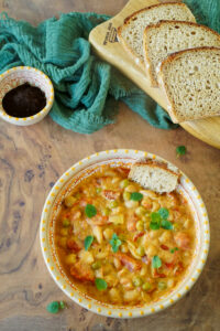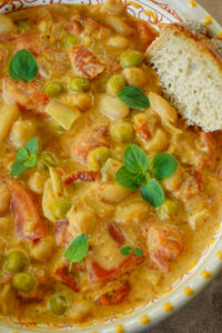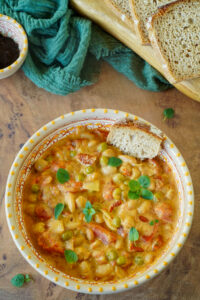 Mój kolejny pomysł na wykorzystanie pomidorów 😉 Tym razem mam dla Was przepis na roślinny gulasz ze strączkami. Ja użyłam białej fasoli, ciecierzycy i groszku. Jeśli chcesz użyj tylko fasolki lub ciecierzycy. A jeśli wolisz dania mięsne dodaj mięso z piersi kurczaka, kiełbaskę lub boczek 🙂