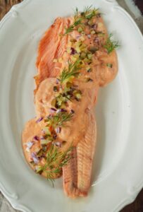 Wędzony pstrąg jest tak smaczny, że nie potrzebuje żadnych dodatków. Ale…ma dla Was bardzo fajny pomysł na ta rybkę 😉 Danie robi się bardzo szybko więc idealnie nadaje się dla zabieganych na przyjemny obiad w tygodniu jak i kolację wigilijną 😉 Jeśli filety z pstrąga zostały połamane w czasie oczyszczania z ości i skóry, nie ma co się przejmować. Wystarczy na półmisku ułożyć w kształt ryby i polać sosem.