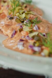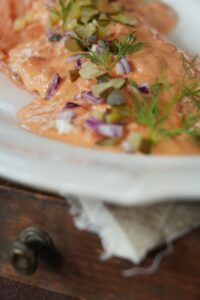 Składniki na sos: 1 łyżeczka koncentratu pomidorowego, , mały pomidor sparzony i pokrojony w kostkę, pół szklanki mleka, pół szklanki śmietanki słodkiej 30%, łyżeczka czubata mąki orkiszowej lub pszennej, 2 łyżeczki drobno posiekanej cebuli (białej lub czerwonej), drobno posiekany ogórek kiszony, odrobina soli i pieprzu, koperek.