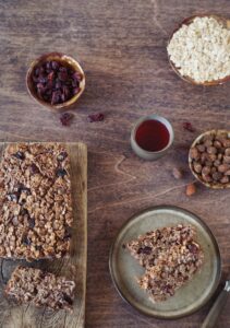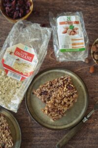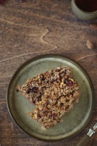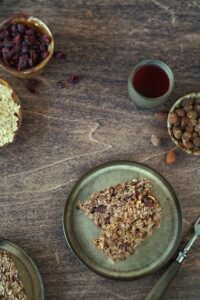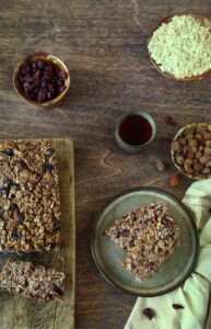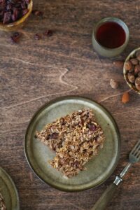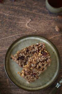 Składniki: 2 szklanki płatków owsianych, 1 szklanka jogurtu naturalnego, 1/2 szklanki miodu, /2 szklanki orzechów (np. włoskich lub migdałów), 1/2 szklanki suszonych owoców (np. rodzynek lub żurawiny), 2 jajka, 1 łyżeczka proszku do pieczenia, 1 łyżeczka cynamonu.